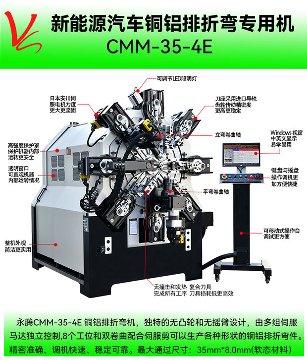 CMM-35-4E铜排折弯机(最大通过尺寸:35mm*8.0mm)集3D折弯机和弹簧机所有的功能于一体的多功能专用机,本机采用独特的无凸轮和无摇臂设计,由多组伺服马达独立控制,永腾铜排折弯机广泛应用于导电排成型,新能源电池连接排、新能源电池模组、铜母排成型、硬排成型、导电排、电池连接排、铜排、裸排成型等。精密准确、调机快速、稳定可靠。
