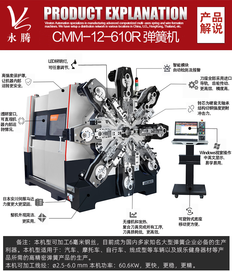 本机型适用于汽车、摩托车、自行车、线成型等车辆以及娱乐健身器材等产品所需的高精密弹簧产品的生产。