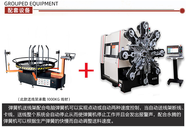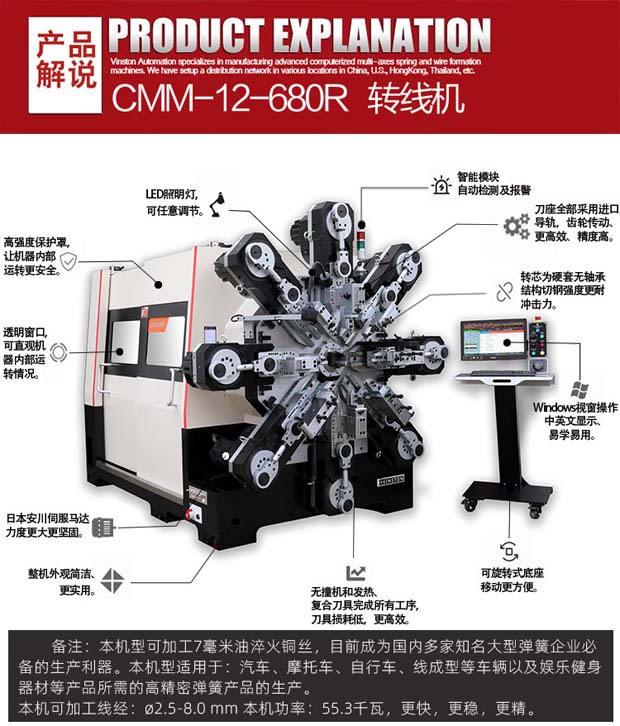 CMM-12-680R电脑弹簧机,转线机.可生产ø2.5-8.0 mm线经弹簧及线成形等)本机采用独特的无凸轮和无摇臂设计,由多组伺服马达独立控制,可以生产各种各样异型弹簧、压簧、拉簧、双扭簧、蜗卷簧、扁簧(发条簧)及各种线成型等。精密准确、调机快速、稳定可靠。