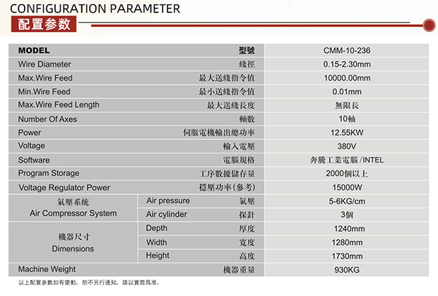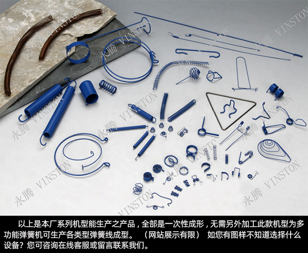 CMM-10-236电脑弹簧机 可生产ø0.15-2.3 mm线径弹簧及线成形等)本机采用独特的无凸轮和无摇臂设计,由多组伺服马达独立控制,可以生产各种各样异型弹簧、压簧、双扭簧、电池簧、扁簧(发条簧)及各种线成型等。精密准确、调机快速、稳定可靠。