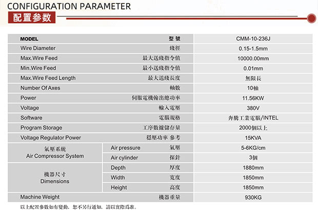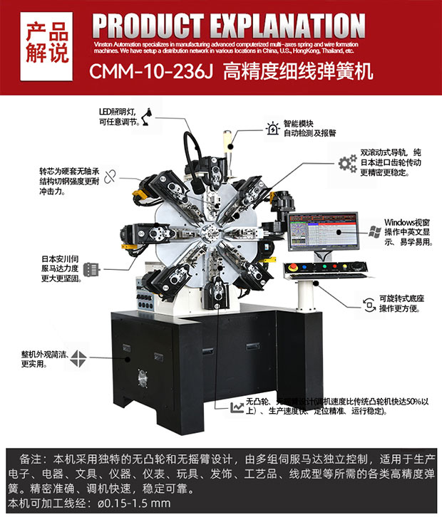 CMM-10-236J 高精度细线弹簧机 可生产ø0.15-1.5 mm线径弹簧及线成形等)本机采用独特的无凸轮和无摇臂设计,由多组伺服马达独立控制,可以生产各种各样异型弹簧、压簧、双扭簧、电池簧、扁簧(发条簧)及各种线成型等。精密准确、调机快速、稳定可靠。