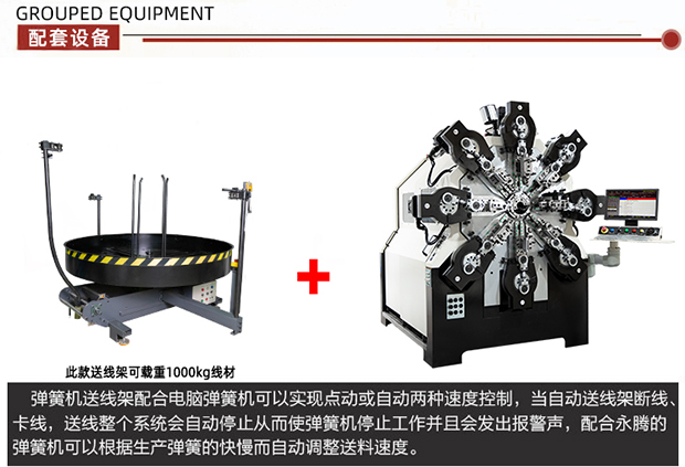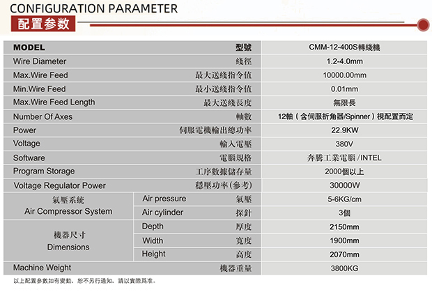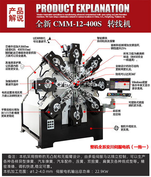 CMM-12-400S/450S/500S 转线弹簧机可生产ø1.2-5.0 mm线径弹簧及线成形等),本机采用独特的无凸轮和无摇臂设计,由多组伺服马达独立控制,可以生产各种各样异型弹簧、汽车弹簧、汽车配件、压簧、双扭簧、扁簧及各种线成型等。精密准确、调机快速、稳定可靠。