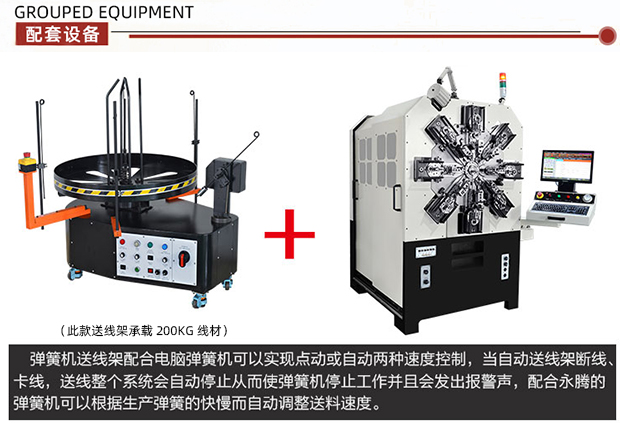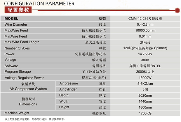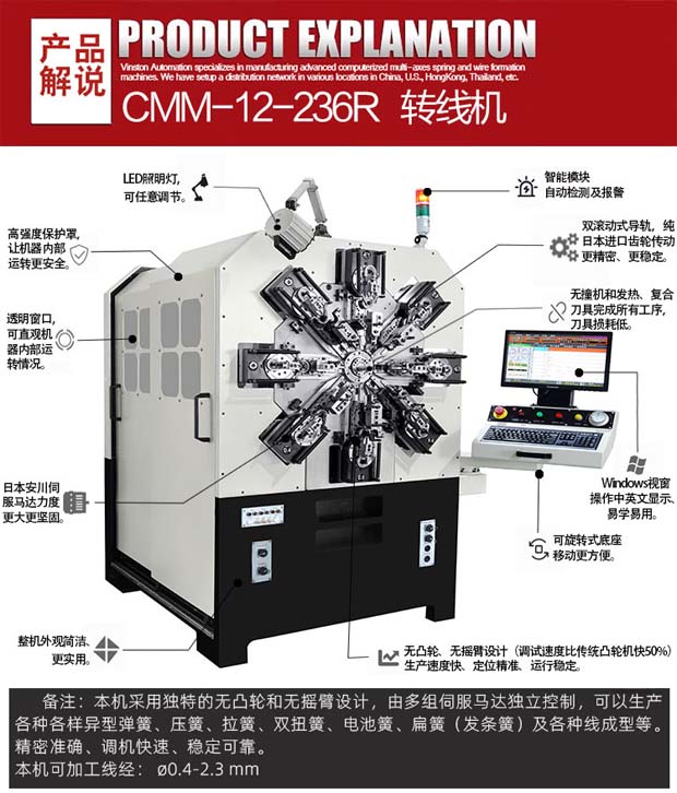 CMM-12-236R 转线弹簧机.可生产ø0.4-2.3 mm线径弹簧及线成形等)本机采用独特的无凸轮和无摇臂设计,由多组伺服马达独立控制,可以生产各种各样异型弹簧、压簧、拉簧、双扭簧、电池簧、扁簧(发条簧)及各种线成型等。精密准确、调机快速、稳定可靠。