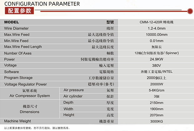 CMM-12-420R转线机,弹簧机 可生产ø1.2-4.0 mm线径弹簧及线成形等)本机采用独特的无凸轮和无摇臂设计,由多组伺服马达独立控制,可以生产各种各样异型弹簧、压簧、拉簧、双扭簧、电池簧、扁簧(发条簧)及各种线成型等。精密准确、调机快速、稳定可靠。(注:此款设备已停产)