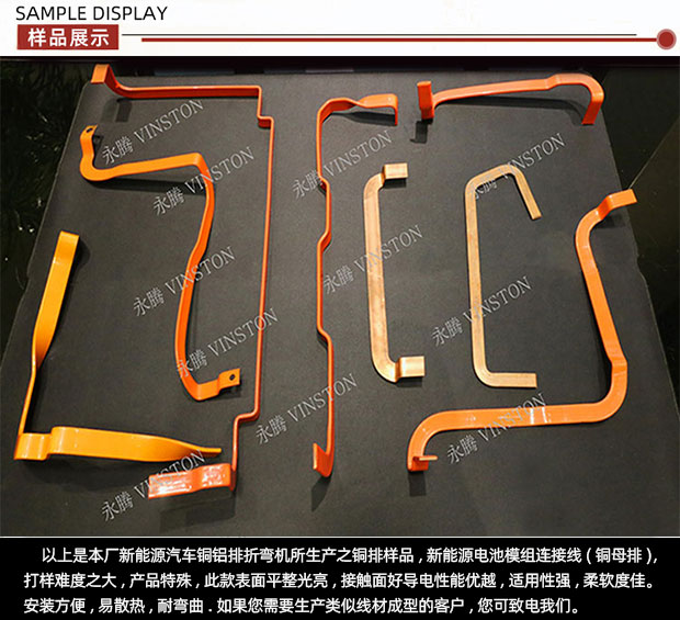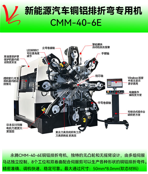 CMM-40-6E铜铝排折弯机(最大通过尺寸:50mm*8.0mm)集3D折弯机和弹簧机所有的功能于一体的多功能专用机,本机采用独特的无凸轮和无摇臂设计,由多组伺服马达独立控制,永腾铜铝排折弯机广泛应用于导电排成型,新能源电池连接排、新能源电池模组、铜母排成型、硬排成型、导电排、电池连接排、铜排、裸排成型等。精密准确、调机快速、稳定可靠。