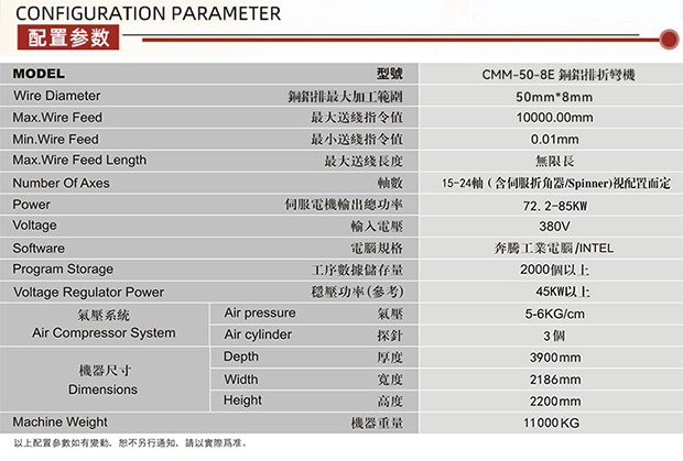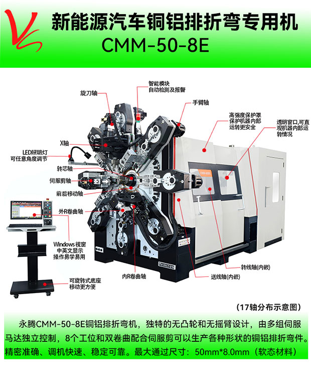 CMM-50-8E铜铝排折弯机(最大通过尺寸:50mm*8.0mm)集3D折弯机和弹簧机所有的功能于一体的多功能专用机,本机采用独特的无凸轮和无摇臂设计,由多组伺服马达独立控制,永腾铜铝排折弯机广泛应用于导电排成型,新能源电池连接排、新能源电池模组、铜母排成型、硬排成型、导电排、电池连接排、铜排、裸排成型等。精密准确、调机快速、稳定可靠。