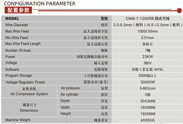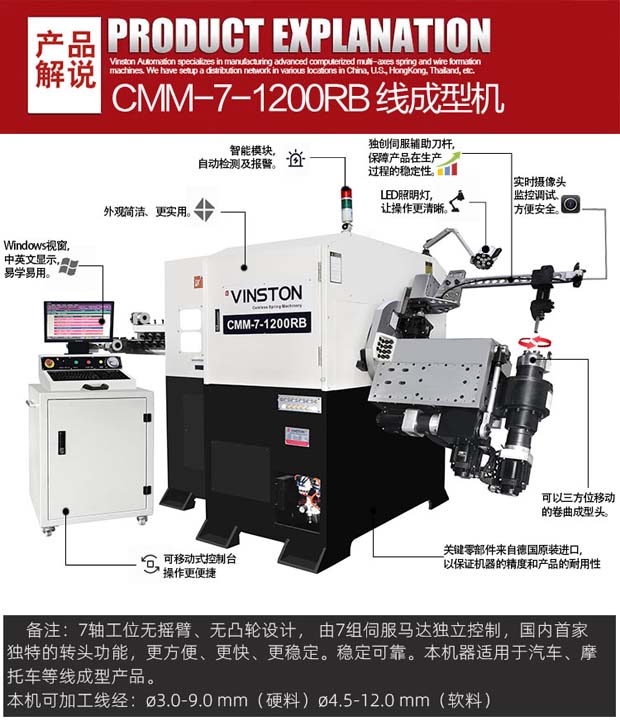 CMM-7-1200RB线材成型机可生产 ø3.0-9.0 mm线经,铁线或者低碳钢可做ø4.5-12.0 mm线经线成型),本机专业生产汽车零部件等线成型,特别适合做大杆件汽车五金线材成型产品7轴工位无摇臂、无凸轮设计, 由7组伺服马达独立控制,国内首家独特的转头功能,更方便、更快、更稳定。稳定可靠。